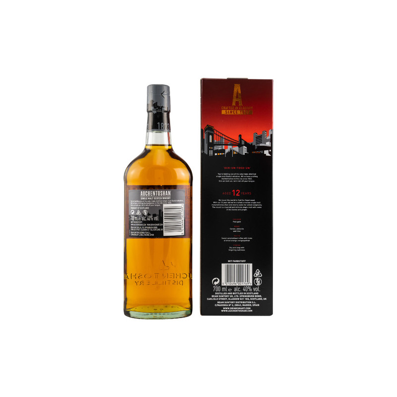 Der Auchentoshan 12Jahre ist nussig und frisch im Duft. Sein Geschmack von Mandeln und süßer Schokolade begeistert. Im Abgang ist er war, mild und leicht trocken.