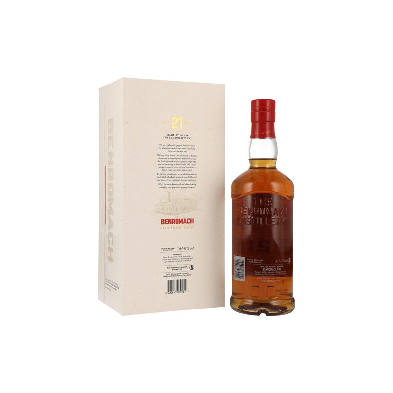 Benromach ist eine kleine Destillerie in der Speyside, doch der Scotch, der dort gebrannt wird, zählt zu den Besten der Welt. Nicht zuletzt, weil Benromach an sich den Anspruch stellt, die ausgewählten Zutaten unter idealen Bedingungen in einen großartigen Single Speyside Malt zu verwandeln. Eine kleine handvoll Mitarbeiter kümmert sich intensiv um die jährliche Produktion, die gewollt niedrig gehalten wird, um die Nachfrage zu vergrößern. Die 21 jährige Premiumabfüllung von Benromach reift in den besten handverlesenen First-Fill-Eichenfässern und edlen Sherryfässern. Ungefärbt und ungefiltert wird er mit 43% abgefüllt.
