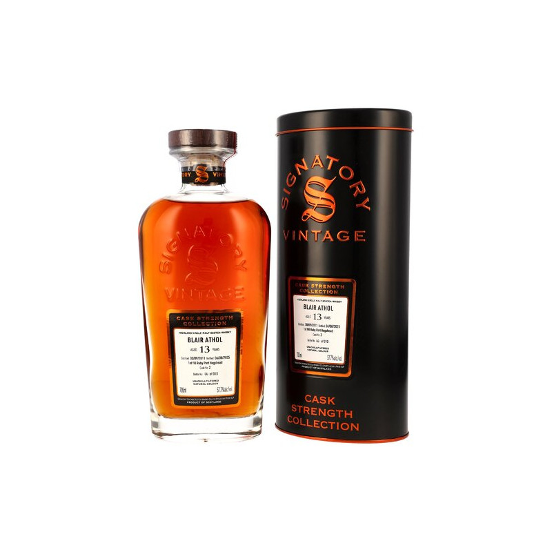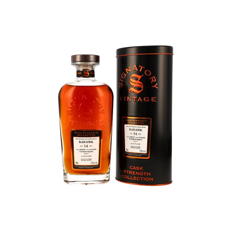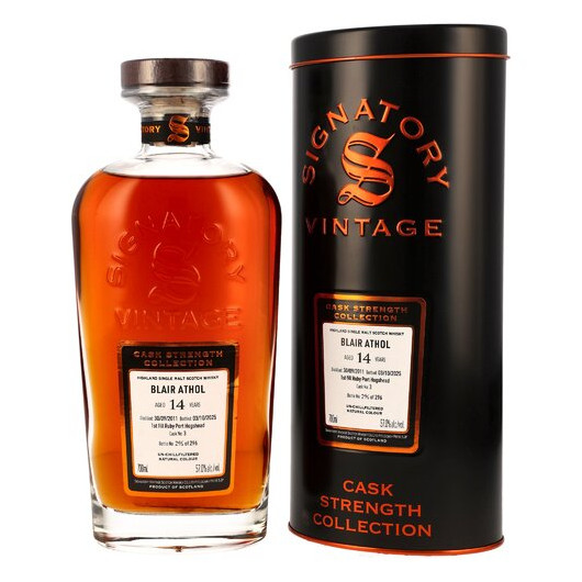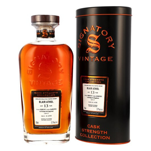 Starke Fässer fassstark abgefüllt: die Cask Strength Collection von Signatory Vintage in der Zusammenfassung. Drei edle Dekanter sorgen jetzt für kraftvollen Nachschub im Premium-Segment des unabhängigen Abfüllers. Faire Preise sind dabei ebenso vertreten wie unverfälschter Single-Malt-Genuss. Der Blair Athol 2011/2025 wurde in der Signatory-Heimat destilliert, dem Highland-Örtchen Pitlochry. Seinen voluminösen Charakter durfte er für diese unabhängige Abfüllung im First Fill Ruby Port Hogshead entwickeln – statt wie häufig in Sherryfässern.