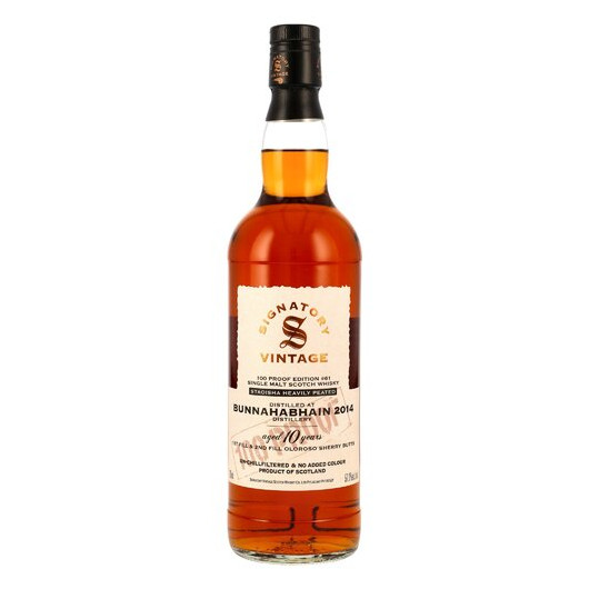 Dieser Single Malt aus der 1881 gegründeten Bunnahabhain Brennerei wird vom namhaften, unabhängigen Abfüller Signatory auf den Markt gebracht. Erst 1988 gründete Andrew Symington die Signatory Vintage Scotch Whisky Company Ltd. Dennoch sind die exklusiven Abfüllungen eines der erfolgreichsten unabhängigen Abfüller Schottlands nicht mehr aus den Regalen von Whiskyfans wegzudenken. Die limitierten Abfüllungen aus wenigen Fässern kommen in Reihen auf den Markt – wie etwa der Signatory Un-Chillfiltered Range. Die 100 Proof Edition schließt seit Anfang 2024 eine Lücke im Signatory-Sortiment. Die Single Malts der Reihe werden mit 57,1% vol. abgefüllt, dem Mindestgehalt, ab dem mit Alkohol getränktes Schießpulver entzündet werden kann. Hohe Prozente treffen dabei auf niedrige Preise. Dieser stark getorfte Bunnahabhain reifte 10 Jahre in First- und Second Fill Oloroso Sherry Butts, bevor er ungefärbt und ungefiltert mit 57,1% abgefüllt wurde.