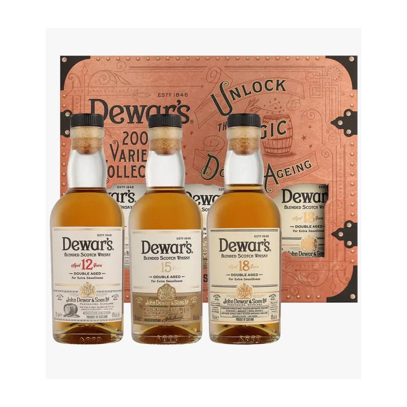 Dieses Probierset enthält jeweils 1 Flasche 0,2 Liter vom Dewar`s 12 Jahre, 15 Jahre und 18 Jahre.