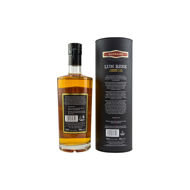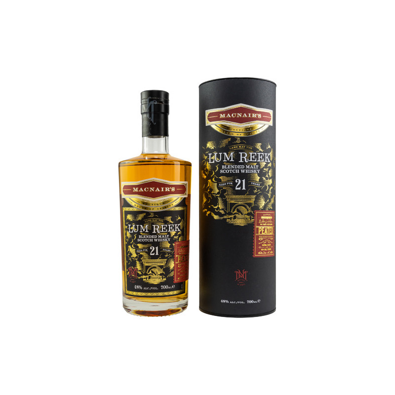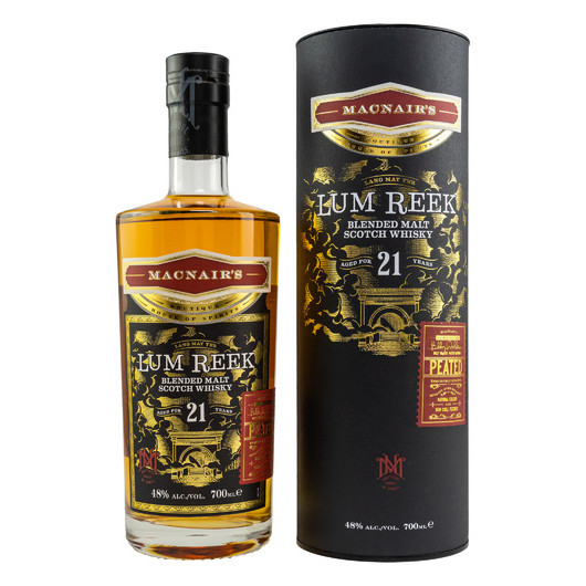 Zeitgenössisch gestaltet, metallisch veredelt, mit Blickfang-Potential: Das ist die neue MacNair’s Range. Vor nicht allzu langer Zeit erlebte die für ihre preisgekrönten, rauchigen Blended Malt Whiskys bekannte Marke ein Revival als Zuhause für Premium-Small-Batch-Abfüllungen. Meisterlich betreut von Whisky-Koryphäe Billy Walker, reifen sie in ausgewählten, innovativen Fässern und fließen weder kühlfiltriert noch gefärbt in die eleganten, schweren Flaschen. Der buttrige Lum Reek 21 Jahre reift in Sherry-, französischen und Virgin-Oak-Fässern. Abgefüllt wird er ungefärbt und ungefiltert mit 48% Alkoholstärke. MacNairs Lum Reek 21 Jahre ist eine Cuvée aus Single Malts von Islay und Speyside – zwei der begehrtesten Whiskyregionen Schottlands. Die Kombination aus getorftem und ungetorftem Whisky ergibt einen perfekt ausbalancierten und komplexen Malt. Die Rezeptur stammt vom Branchenveteranen und Master Distiller/Blender des Jahres, Billy Walker, und beinhaltet gereiften GlenAllachie Single Malt.