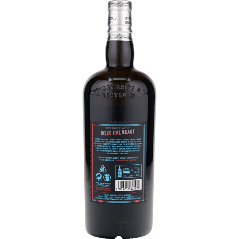 Mit der Timorous Beastie "Meet the Beast" Limited Edition lässt Douglas Laing das kleine Biest von der Leine. Abgefüllt mit kräftigen 54,3% und ganz in Douglas Laing Tradition ungefärbt und nicht kältefiltriert, lässt die kleine Highland Maus die Muskeln spielen ohne den typischen Highland Charakter zu vernachlässigen. Dieser limitierte Whisky beeindruckt nicht nur mit einem kräftigen Alkoholgehalt, sondern auch mit einer perfekten Balance aus intensiven Aromen und einer unvergleichlichen Tiefe, die jeden Schluck zu einem wahren Abenteuer machen. Die sorgfältig ausgewählten Zutaten und die meisterhafte Destillation verleihen diesem Whisky seinen einzigartigen Charakter.