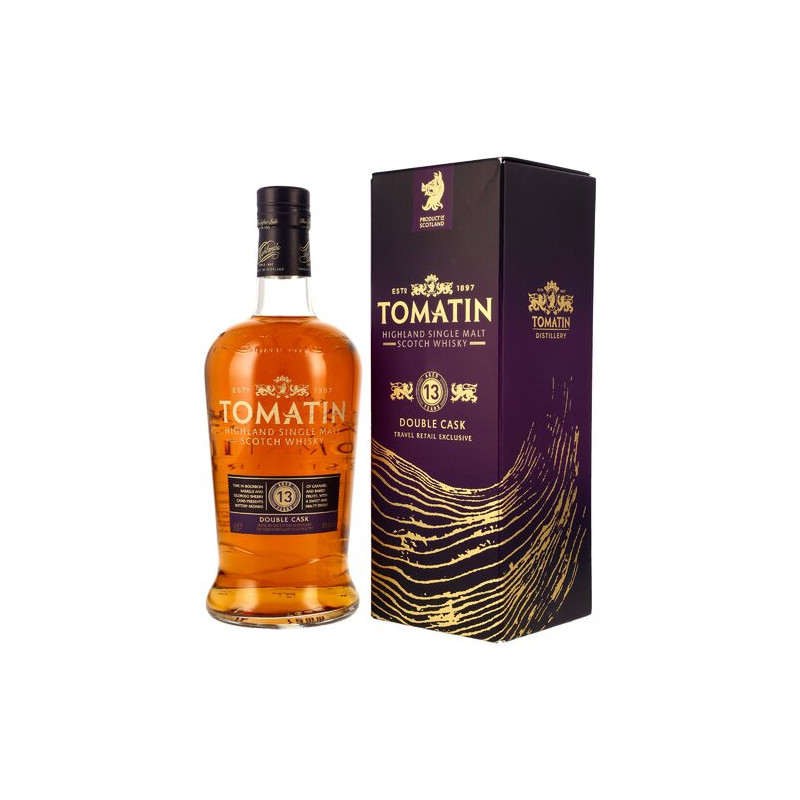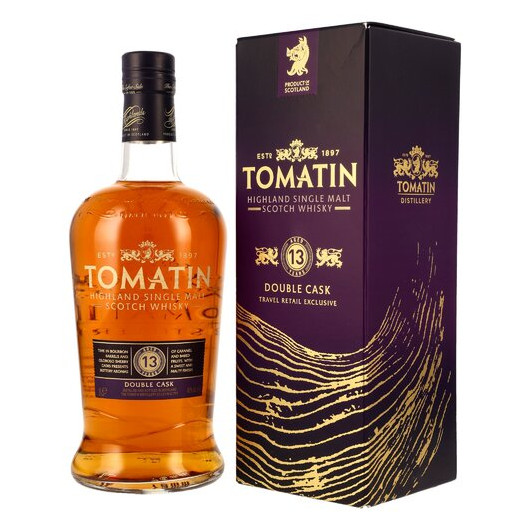 Tomatin Double Cask 13 Jahre verströmt in der Nase Aromen von gebackenen Äpfeln und Birnen, verfeinert mit Nelkenkaramell und tropischen Noten mit Anklängen von Kokosnuss und Guave. Am Gaumen entfalten sich Aromen von schokoladigem Granola, mit Joghurt überzogenen getrockneten Cranberries und Sultaninen, abgerundet mit einem Hauch Zimt. Abgefüllt mit 43% in der 1,0 Liter-Flasche.